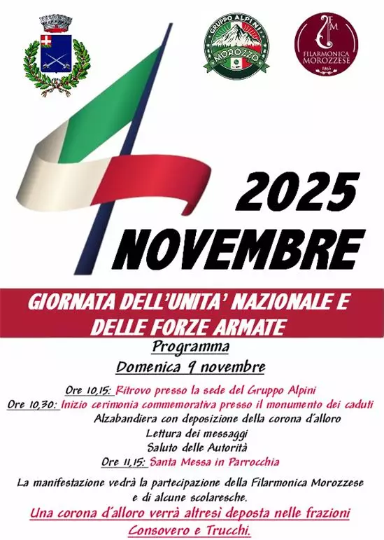 Descrizione In allegato il programma della giornata dell'Unità Nazionale e delle Forze Armate che si svolgerà domenica 9 novembre 2025 a partire dalle ore 10,15.