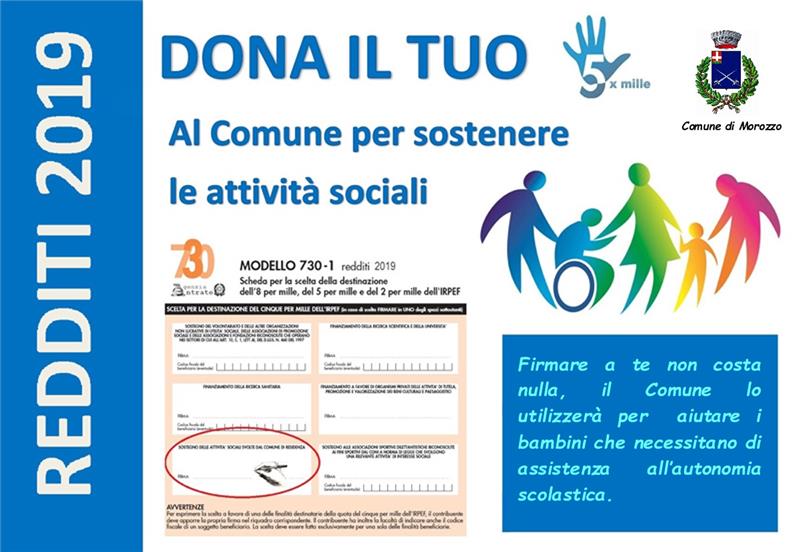 Anche quest’anno è riconosciuta la possibilità, per i contribuenti, di destinare il 5 per mille delle trattenute Irpef al Comune di residenza. Per farlo è sufficiente, al momento della compilazione del modello Unico, della CU o del 730 relativi ai redditi dell’anno 2019, firmare nell’apposito spazio, all’interno del riquadro con la scritta "Sostegno delle attività sociali svolte dal Comune di residenza".